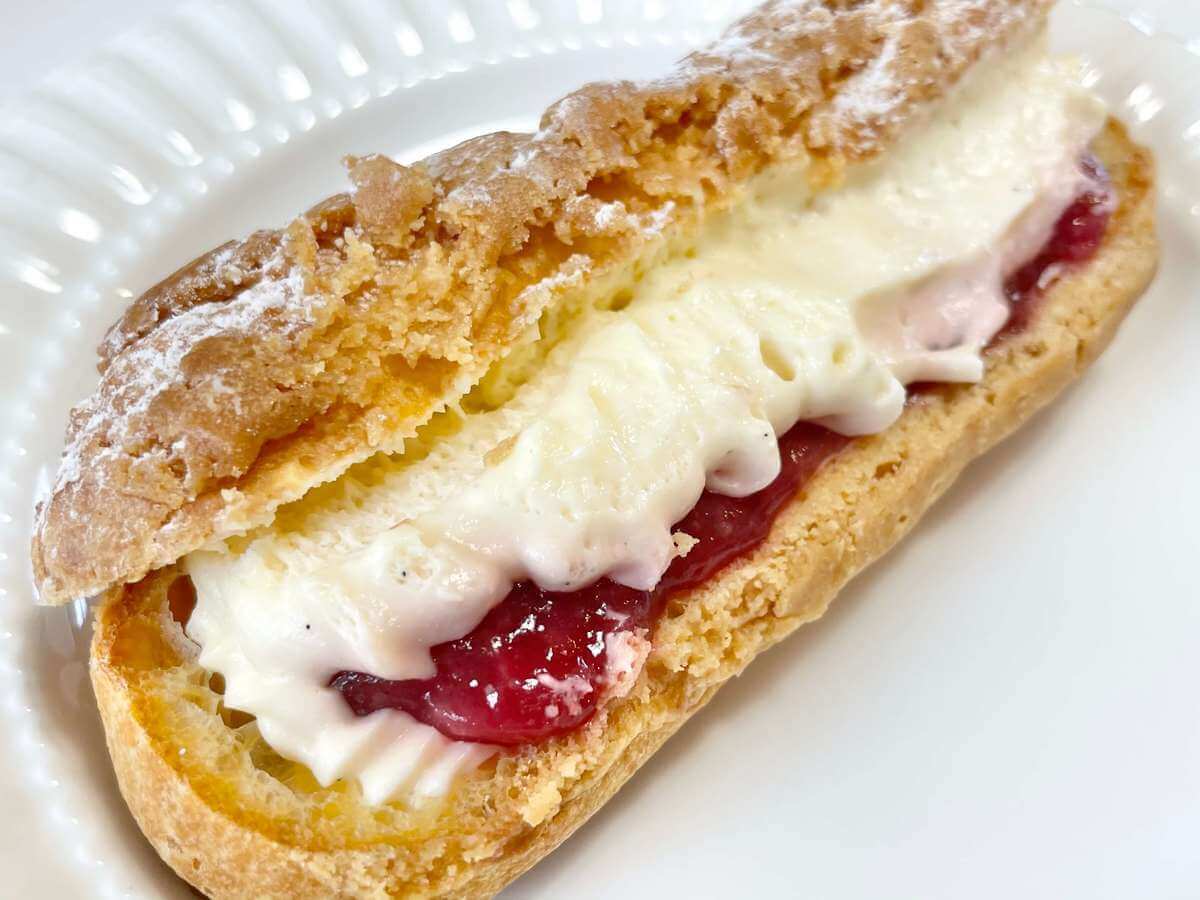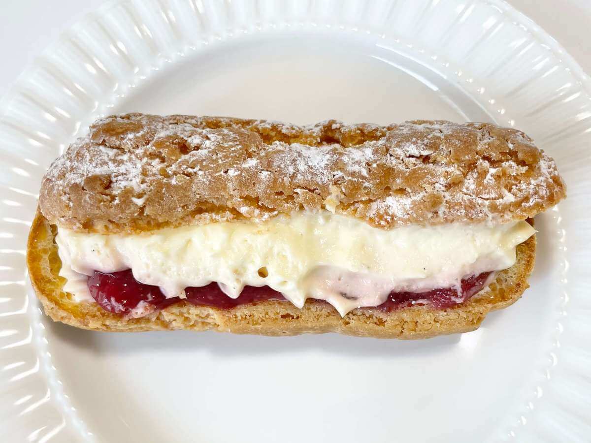 バニラクリームとストロベリーソースが、クッキー生地のエクレアに挟まっています。