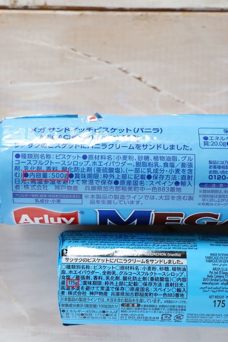 内容量を見ると、ビッグサイズの方は500g、通常サイズの方は175gという、約2.85倍以上もの違いがありました。