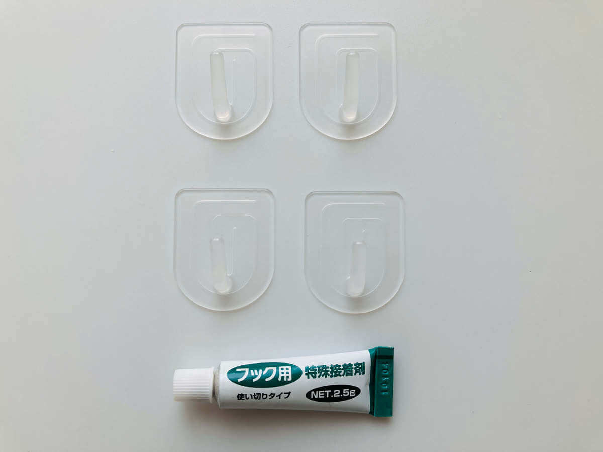付属の接着剤で接着して、壁紙に穴を開けずにフックを取り付けられます。しかもはがすとき、跡が残りにくいというメリットも。