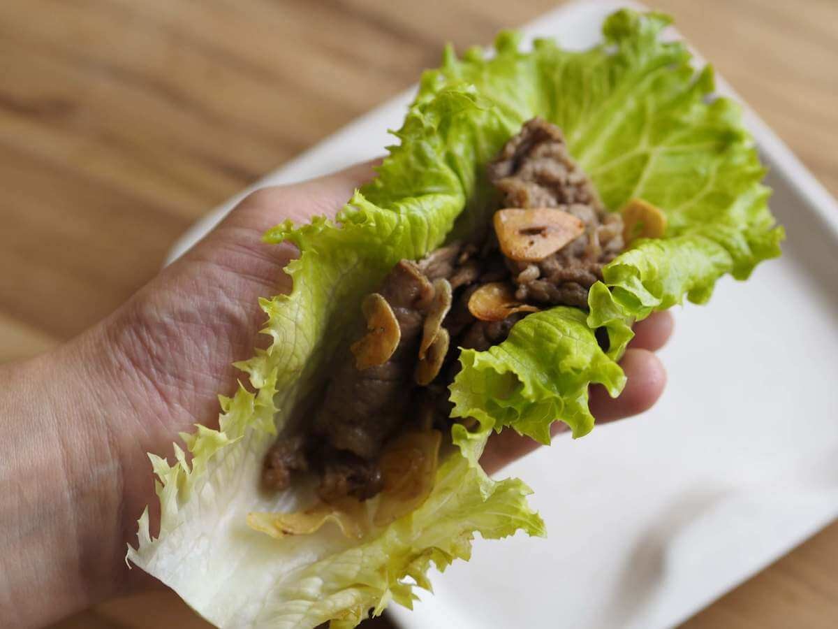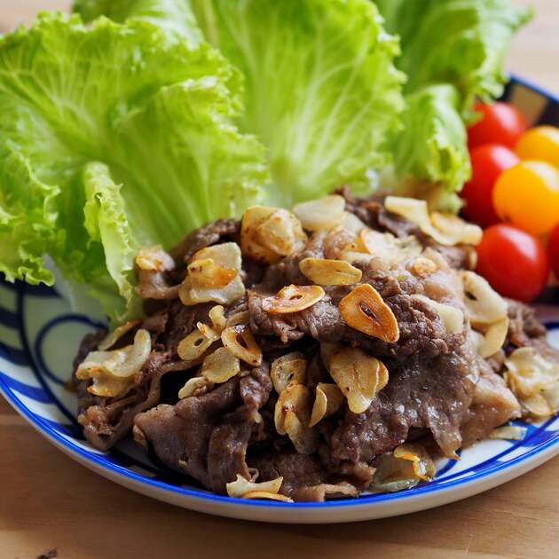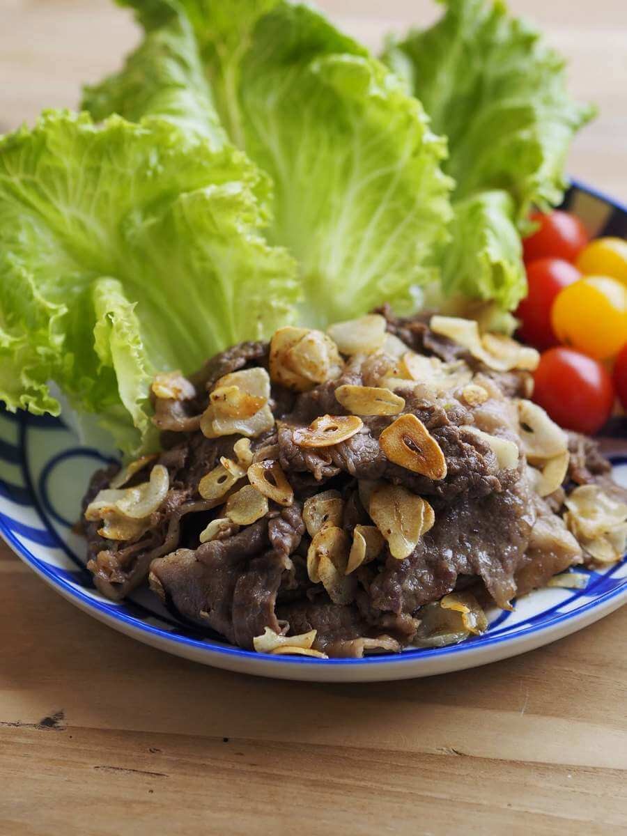 器に盛ってにんにくを散らし、葉野菜で巻いて食べましょう。ごはんをのせたらいくらでも食べられますよ♪