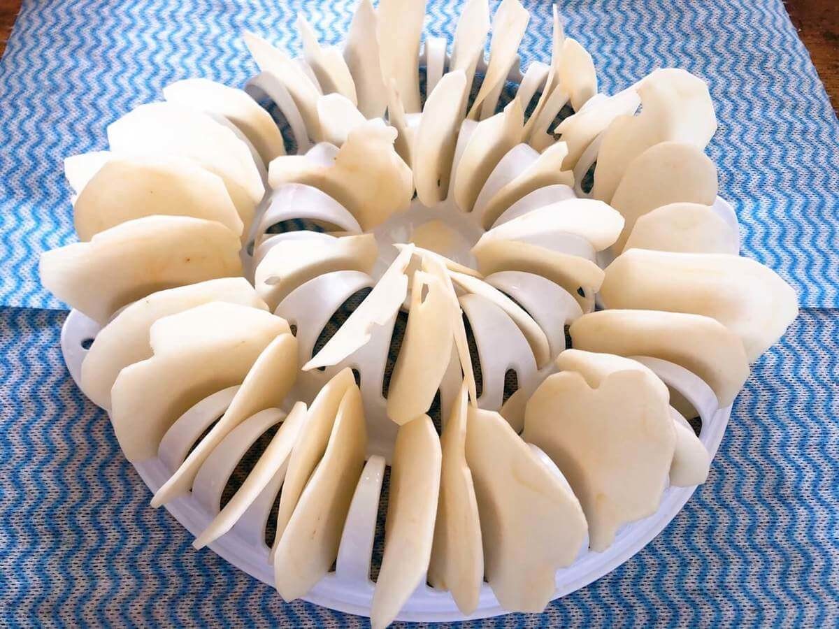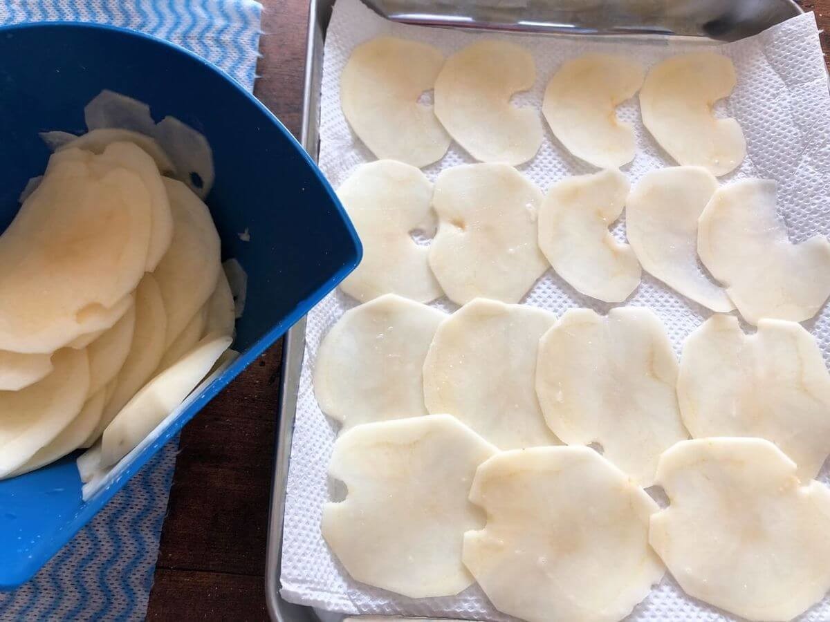 厚みにばらつきがあると仕上がりのパリパリ加減に差が出るので、よっぽど包丁捌きに自信がある人以外はスライサーを使うことをおすすめします。皮はむいてもむかなくてもOK!