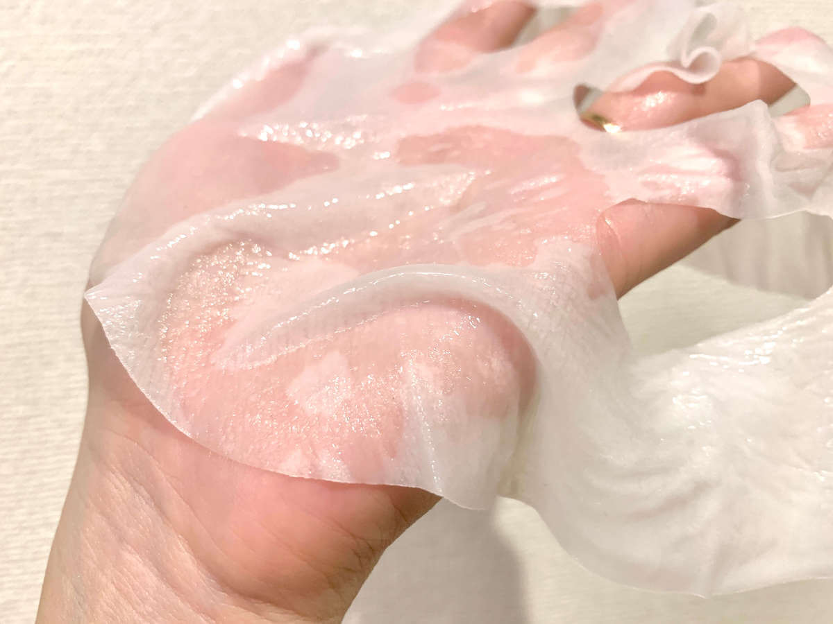 乳液のようなミルク状のエッセンスが浸されたシートマスク。ヌルつきやベタつきもなく使いやすい。かつ、しっとりとした保湿効果がパック後も続きました。