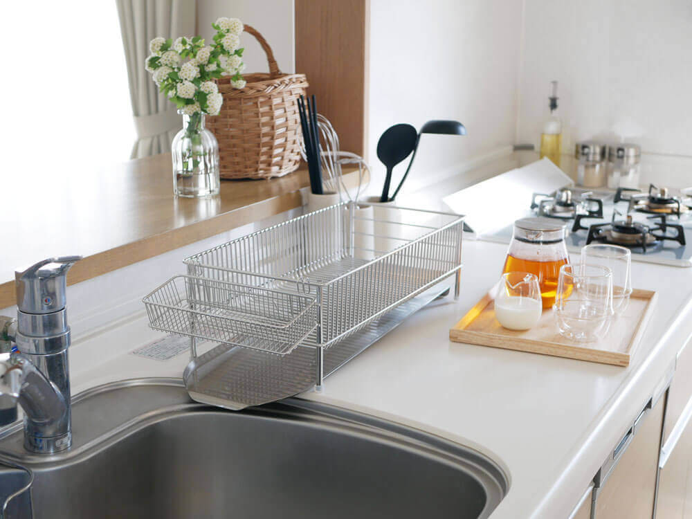 シンクの狭いキッチンや、作業台に奥行がある場合には、横置きタイプの「水切りかご」がおすすめ!
