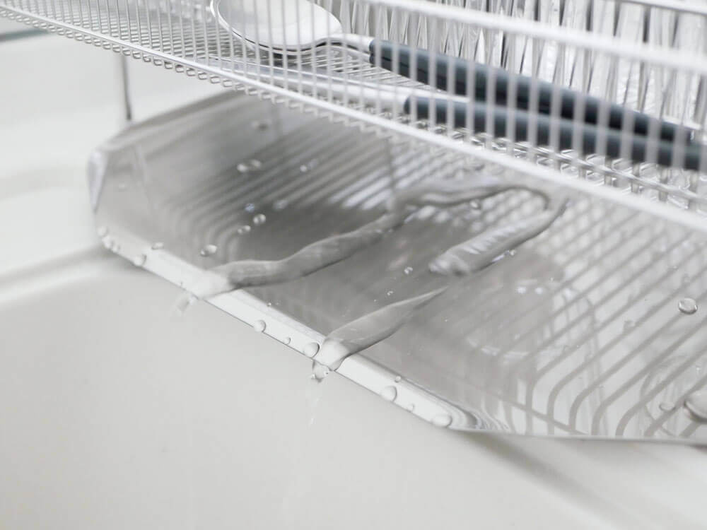 斜めに傾いているので、洗い物の水が「トレー」にたまらず、シンクにサラサラと流れ落ちます。