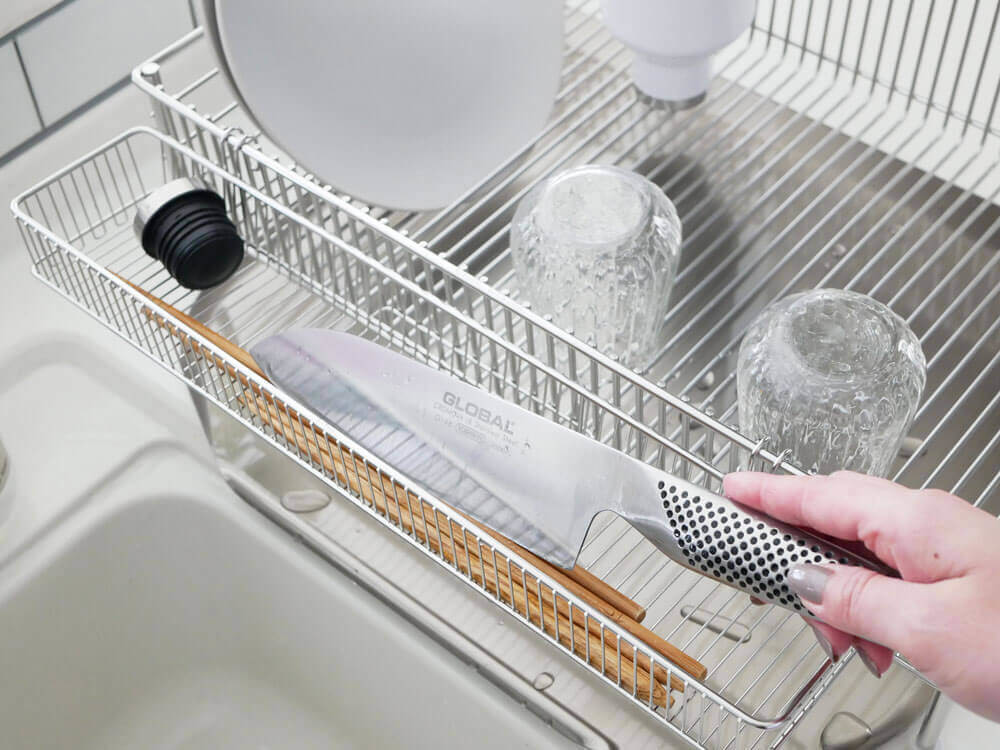 長い箸や包丁も横に寝かせ、安全に水切りできる「カトラリーポケット」。