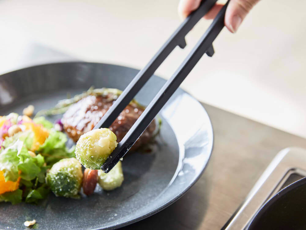 トングなのに片面はスリットがあるので汁切りができ、 スプーン形状で盛りつけた後にソースをかけてステキな盛り付けが可能。