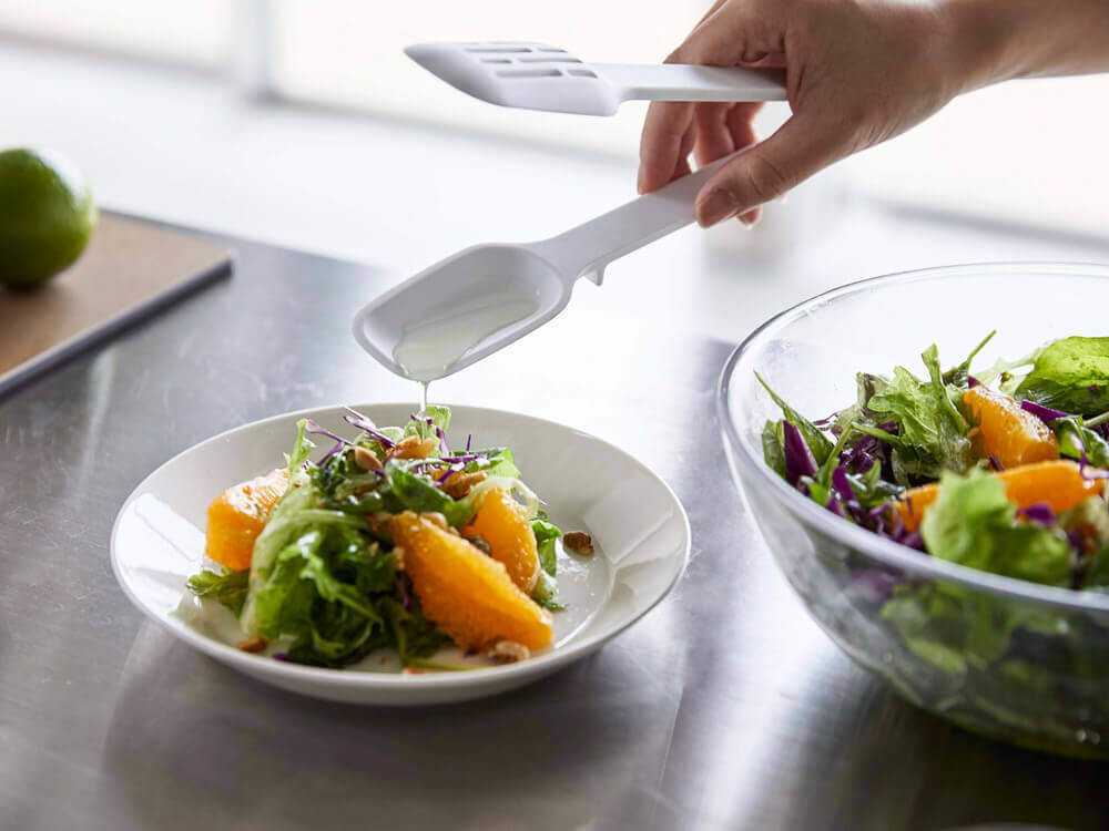 「シリコーンスプーントング」は、片面はスプーンで、もう片面は水分を切ることができるスリット入り。トングなので、サラダやお肉などを小さい食材もしっかり掴め、スプーン形状の面でドレッシングやソースを仕上げにかけられます。