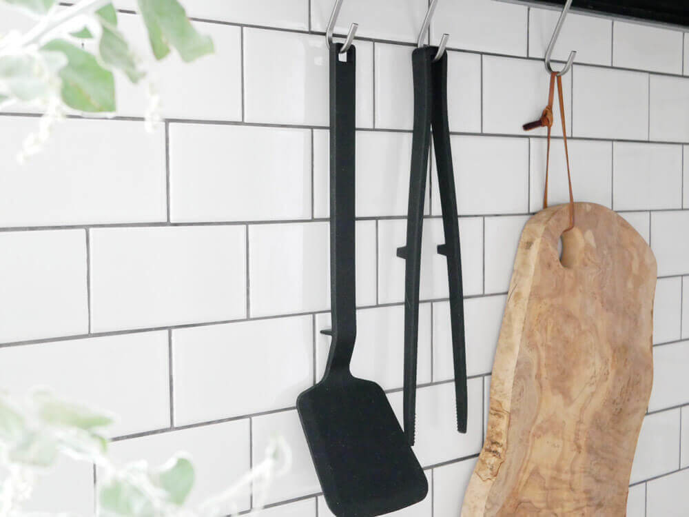 「菜箸トング」と「スプーントング」は、U字型になっているので簡単に掛けられ、「フライ返し」と「お玉」は持ち手の先端には穴が空いており、フックなどに引っ掛けて収納ができます。