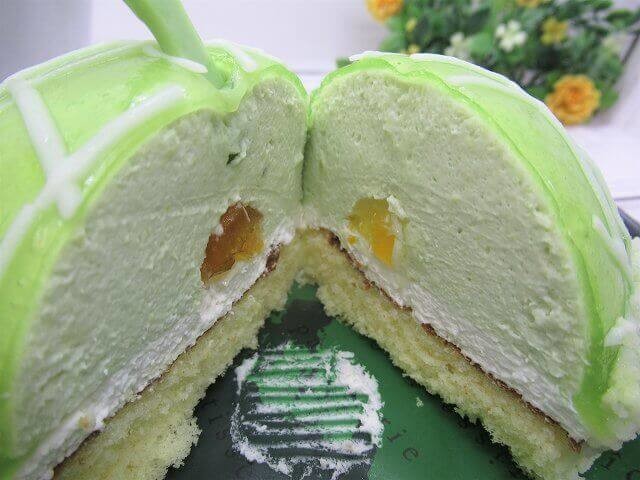 カットして断面をみてみると、メロンムースの真ん中に赤肉メロンゼリー入りのソースが入っており、いいアクセントになりそうですね。