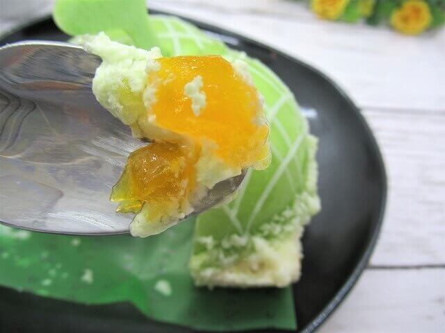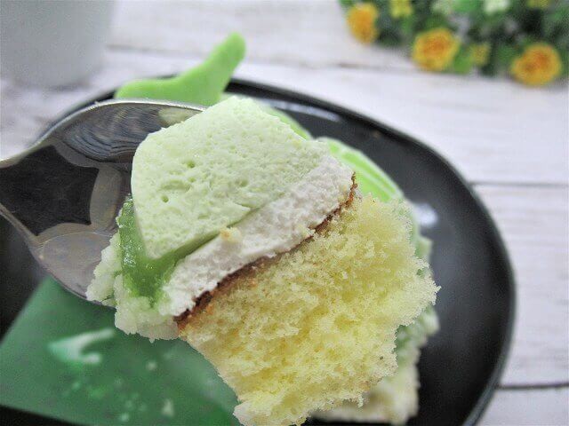 メロンムースは口の中ですぐに溶けるほど柔らかく、バニラ風味のカスタード入りホイップクリームの甘さと、スポンジのふわふわ感とがすべて一体となり絶妙なバランス!