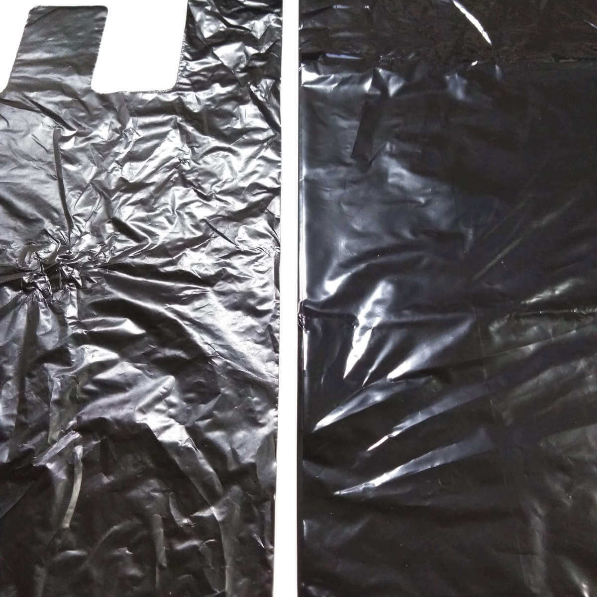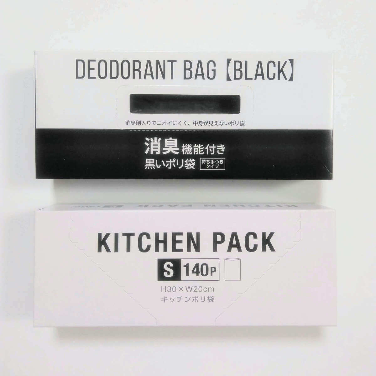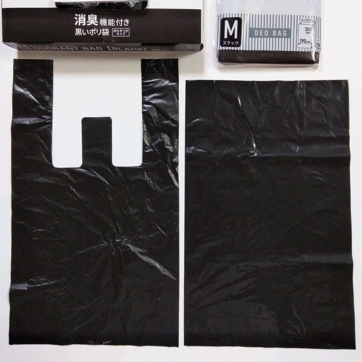 消臭機能付き黒いポリ袋(持ち手つきタイプ)と並べてみました。