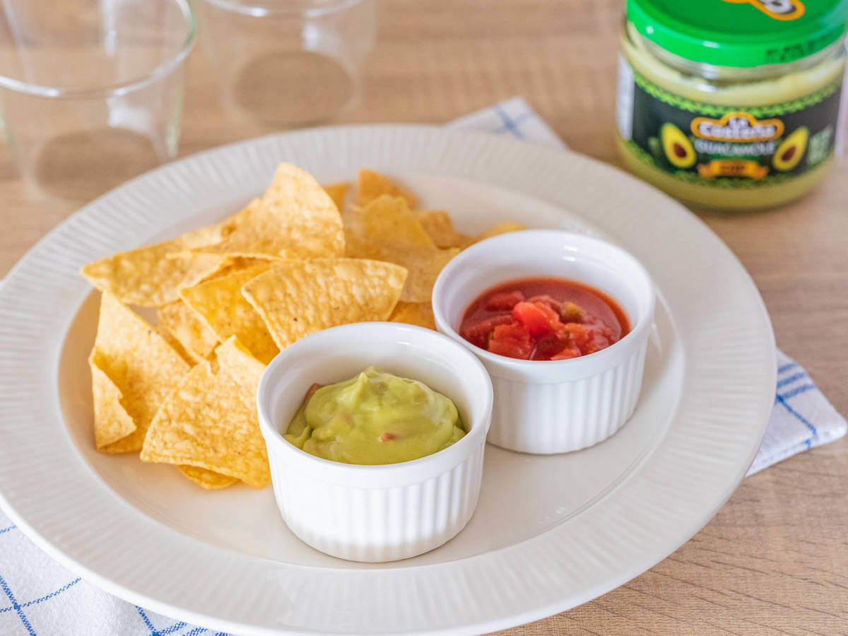 タコスチップスにワカモレとサルサソースを一緒にディップしていただくことで、うまさ倍増。アルコールのおともやおやつにぴったりの味わいです。