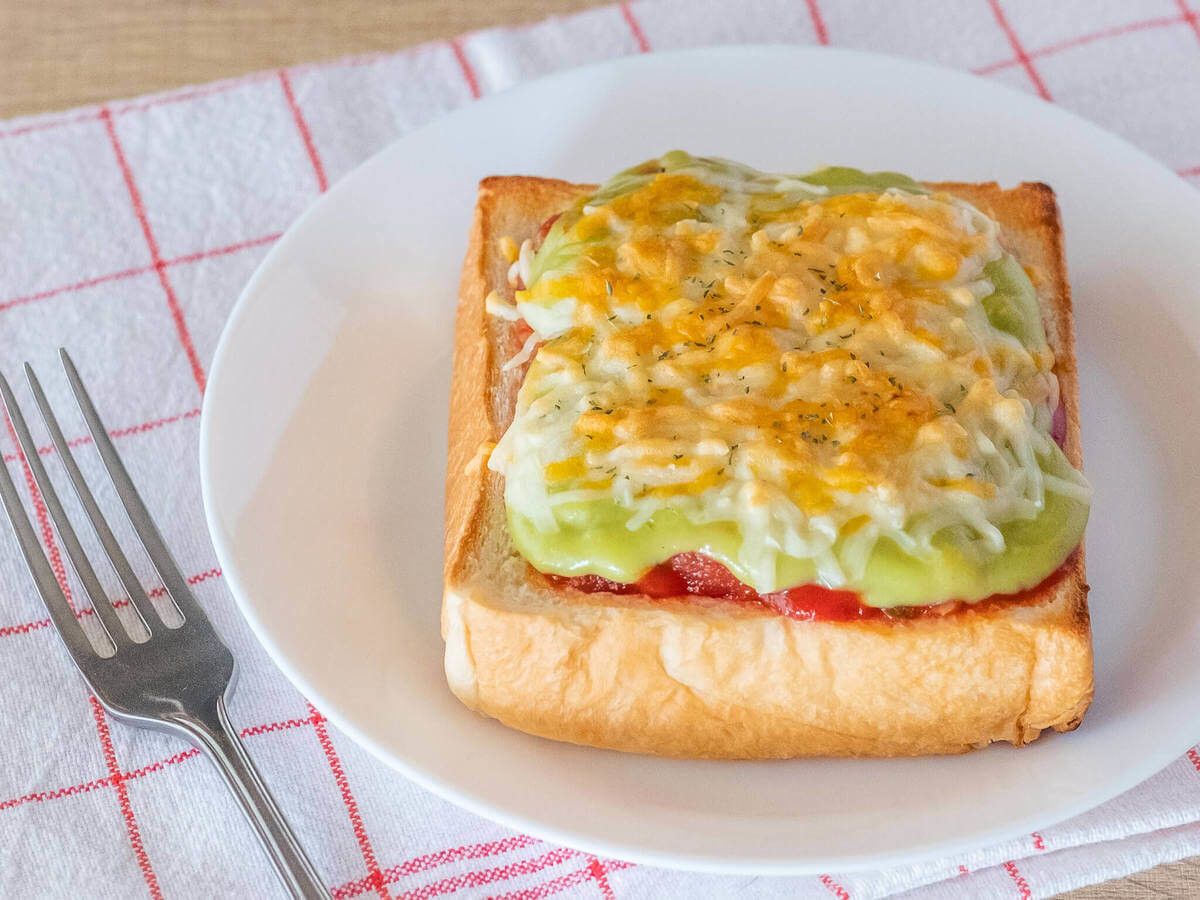 「ワカモレ(アボカドディップ)」と市販のトマトソースを食パンにのせ、とろけるチーズをたっぷりとのせてトースターでこんがりと焼けば、あっという間に「アボカドチーズトースト」が完成!