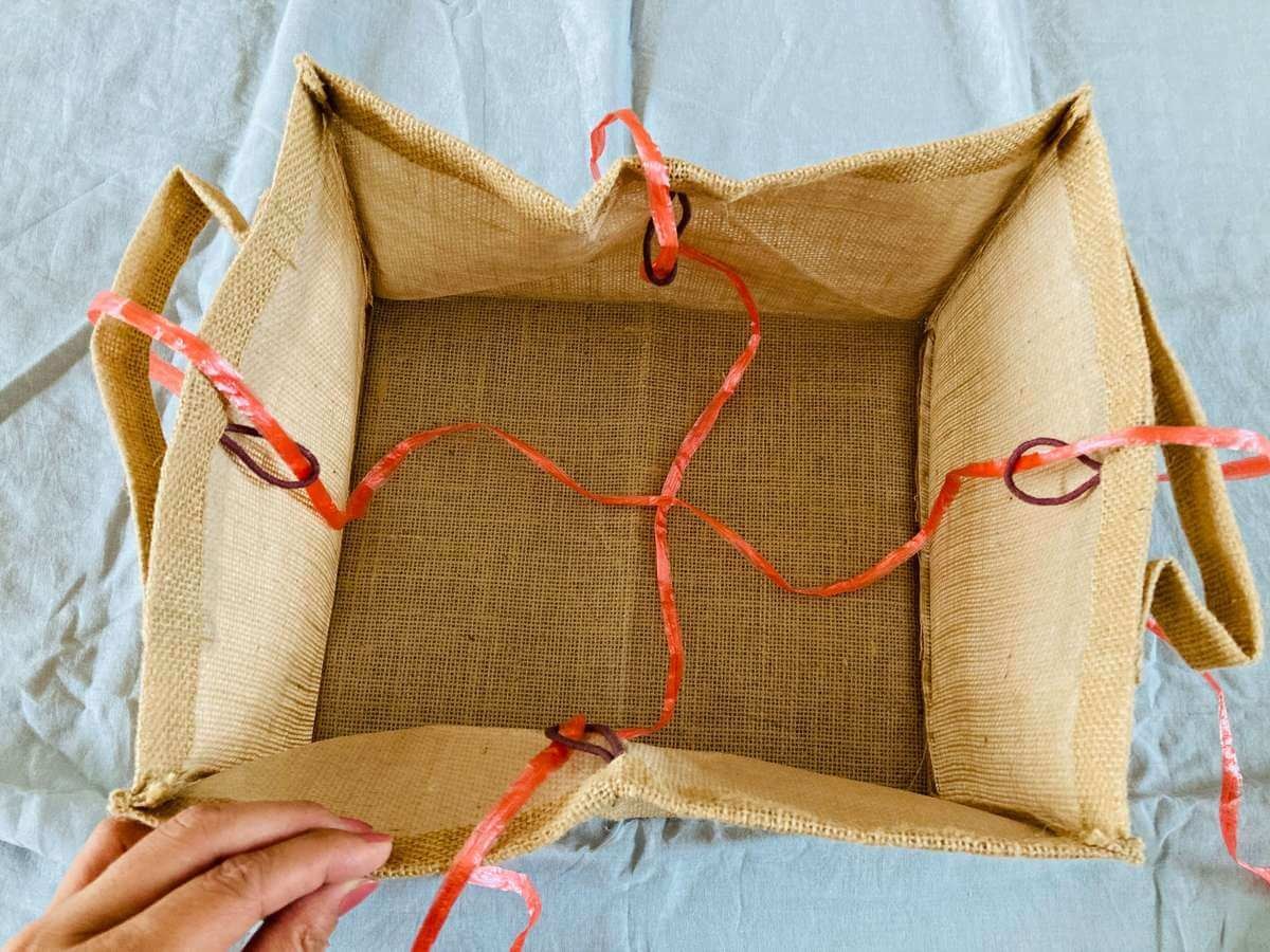 古新聞がたまったら、セットしておいたビニールひもを縛るだけ。持ち上げてみても安定感がありました。