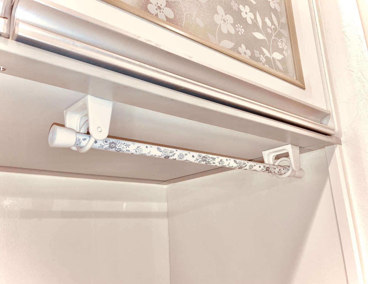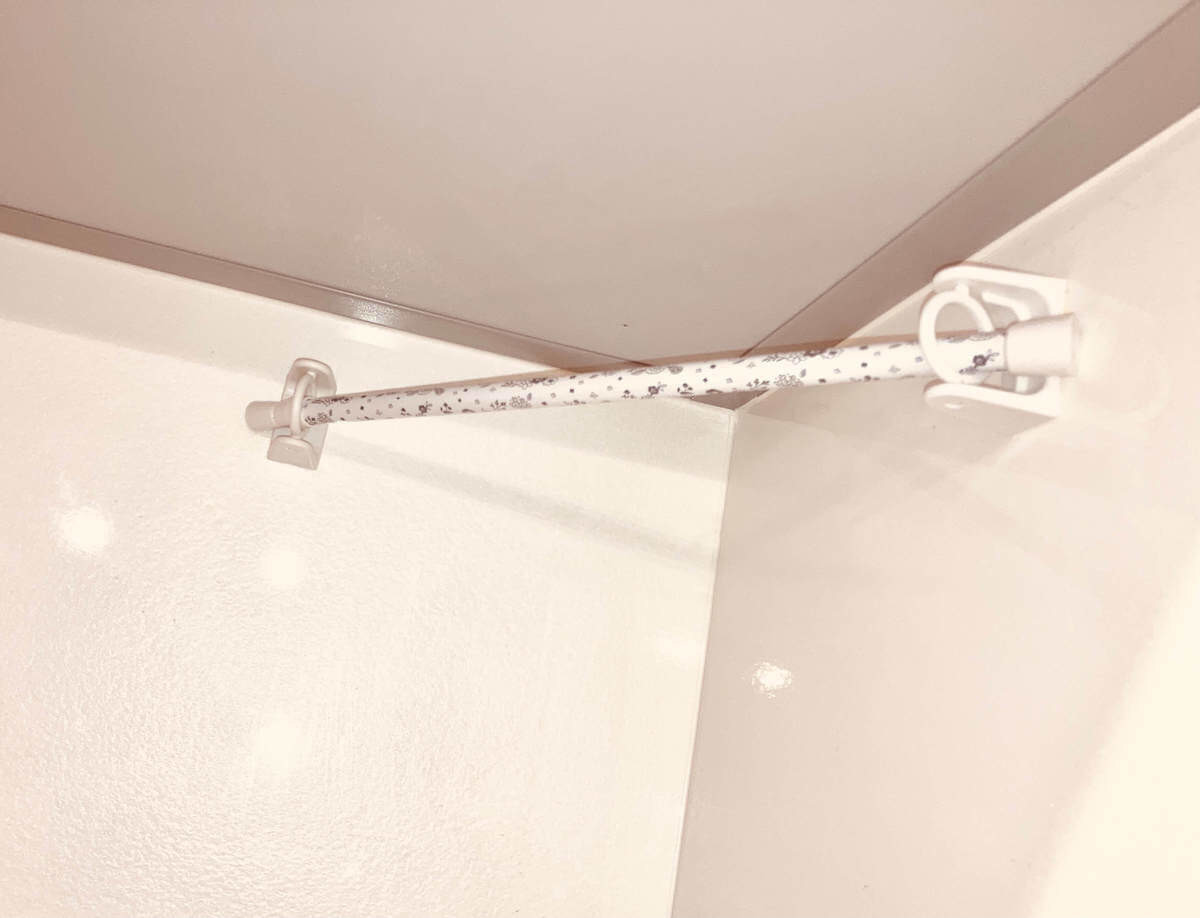 セリアの「粘着テープ リングブラケット2P 110円(税込)」は、リング部分に突っ張り棒を通すだけで収納スペースを生み出せるんです。