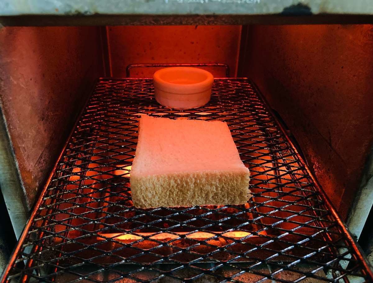 今回は6枚切りの食パンを四つ切りにして試すことにします。トースターの奥にスチーム皿を、手前に食パンを入れました。いつもどおり1000wで2分30秒焼いてみます。