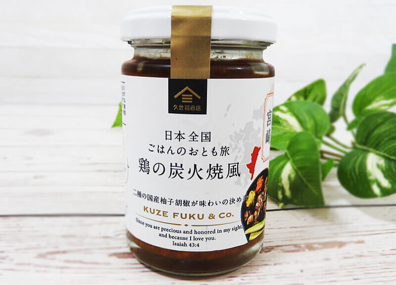 宮崎の郷土料理「鶏の炭火焼」風に仕上げたのだという久世福商店「鶏の炭火焼き風」。青柚子胡椒と赤柚子胡椒が味の決め手なのだそうです。