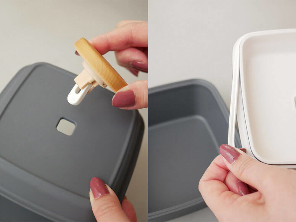 フタのツマミを取り外す際は、フタ裏の留め具をスライドさせ、カチッと音がするまで押し込み、留め具を垂直に起こせば簡単につまみが外れます。