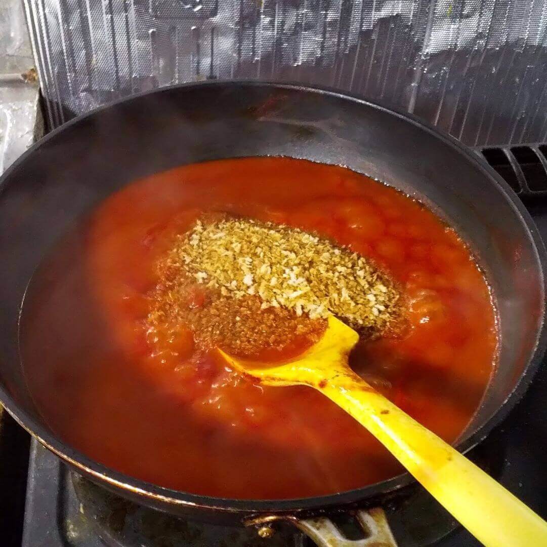 ③ニンニクの香りがオリーブオイルにうつったら、無塩のトマトジュース900mlを入れ、強火で5分煮詰める