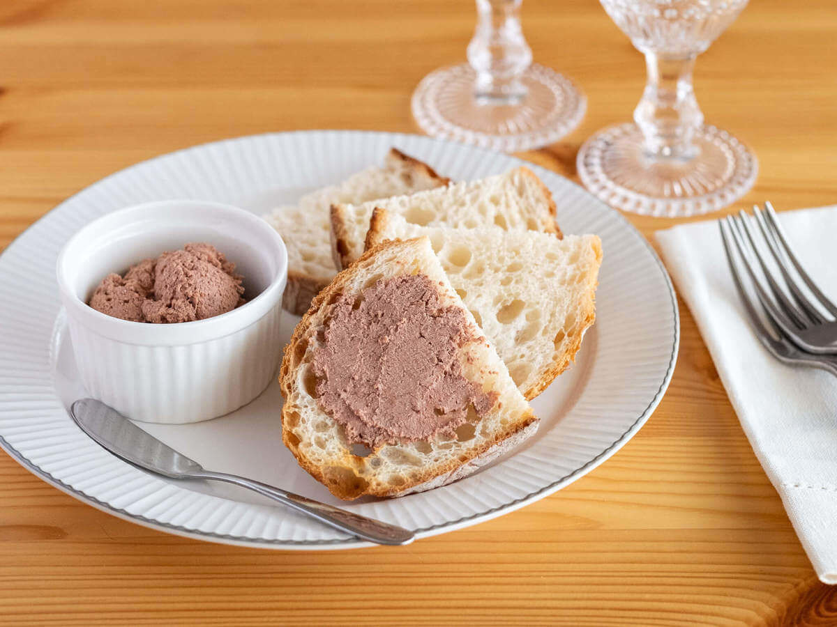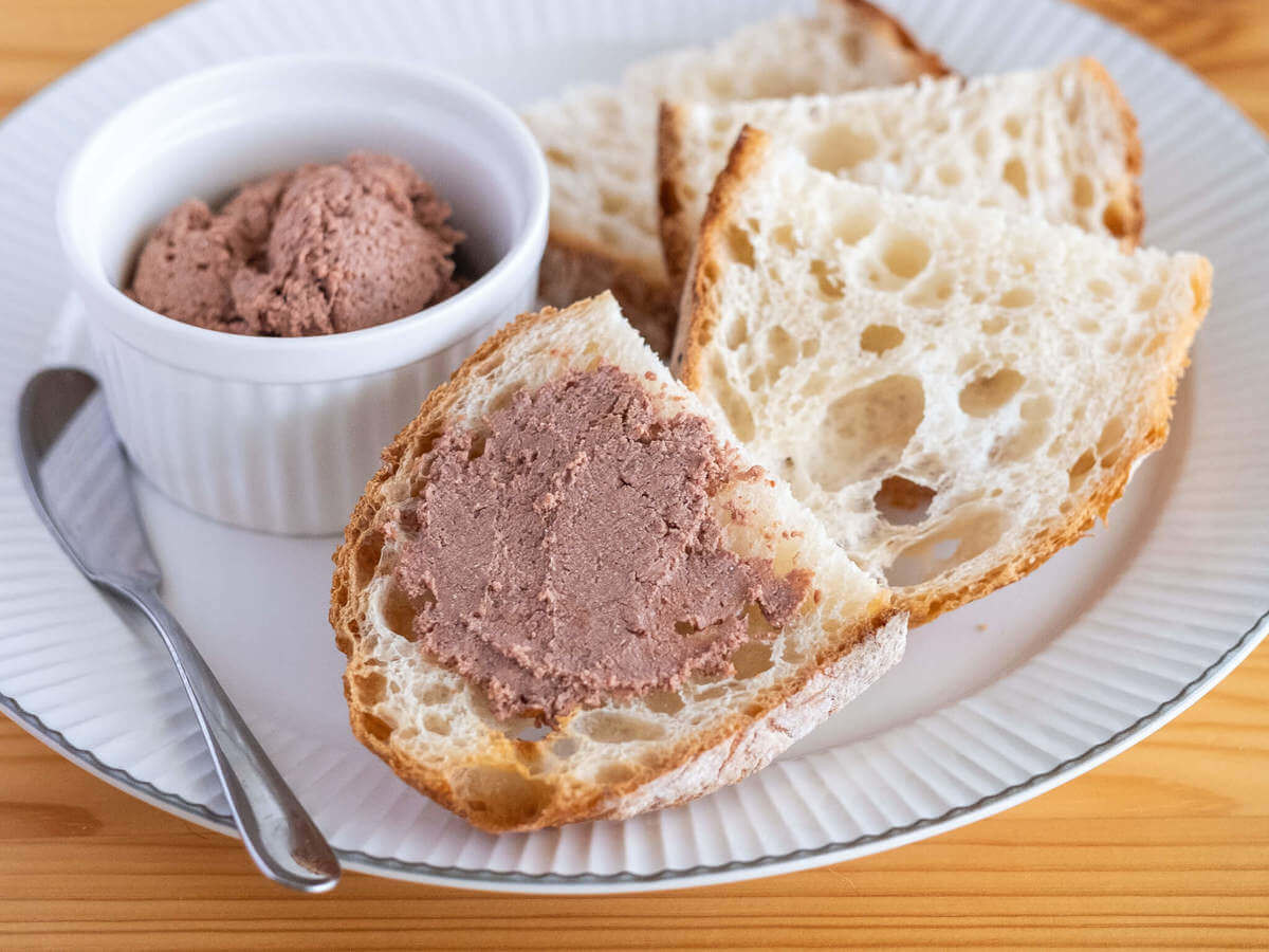 しっとりとしてやわらかいパテなので、ポロポロと落ちてくることなく、バターナイフやスプーンなどを使ってバゲットにきれいにぬることができます。