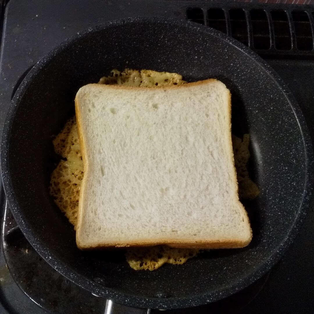 その上に6枚切り食パンをのせて弱火で1分半焼き、ひっくり返します。