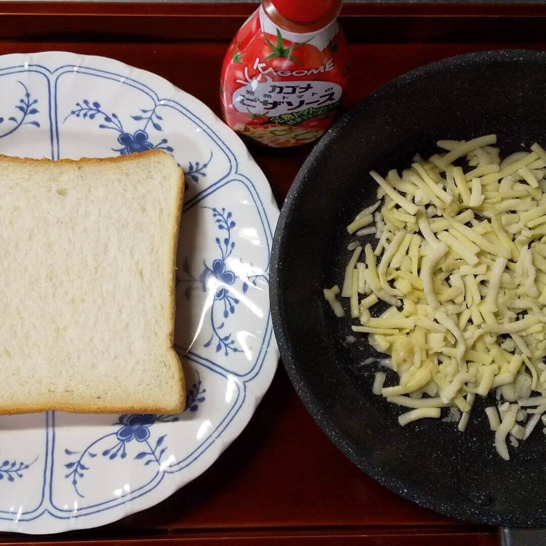 材料は、ミックスチーズ60g、ピザソース、6枚切り食パンのみです。