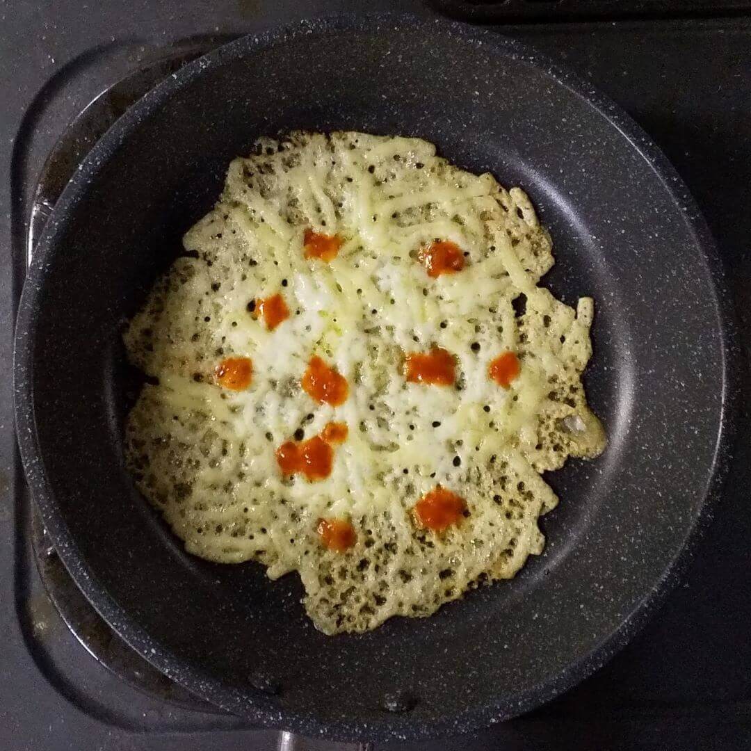 周りがカリッとしたら、ピザソースを10滴かけます。
