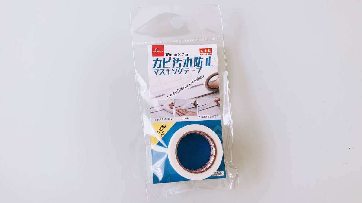 こちらはダイソーで購入した「カビ汚れ防止マスキングテープ」110円(税込)です。 これ、ただのマスキングテープに見えますが違うんです。 なんと防かび剤入りのマスキングテープという画期的なアイテムなんです。
