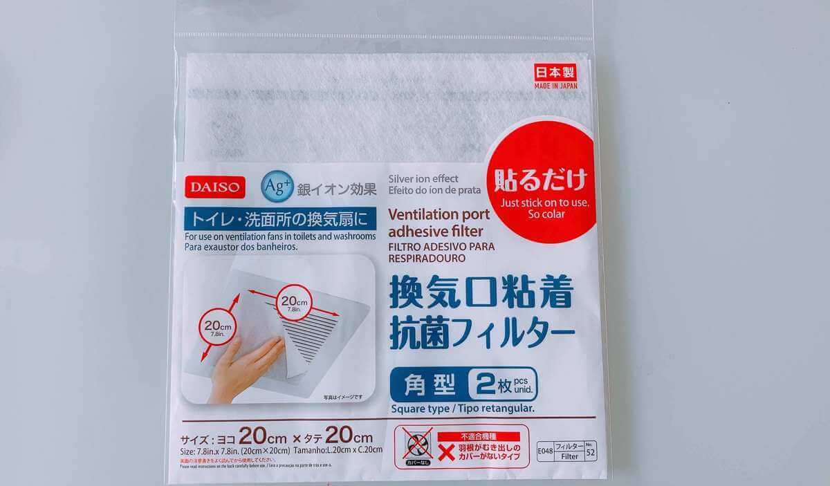 ダイソーの「換気口粘着抗菌フィルター」110円(税込)です。20cm×20cmの2枚入りなので1枚あたり50円と単価としては高く感じるかもれませんが、買う価値ありなんです。