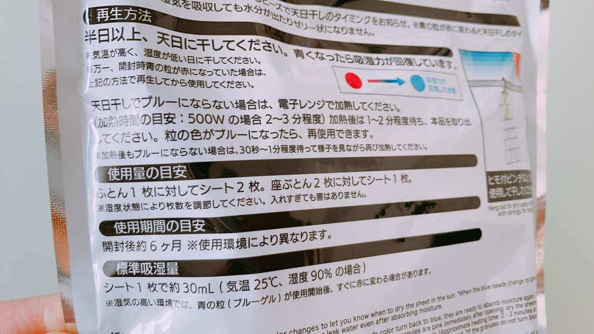 天日干しでも青に戻らない場合は500wで2〜3分加熱し、しばらくまって冷めた頃に取り出す方法でもOKだそうです。 さらに魅力的なポイントが、水分を吸収しても中のビーズがゼリー状になったりしないこと。布団にも安心して挟むことができます。しかも、使用期間の目安はなんと6ヶ月! 1年で220(税込)というなんとも経済的でありがたい除湿剤。今日から私の布団は毎日サラサラです。