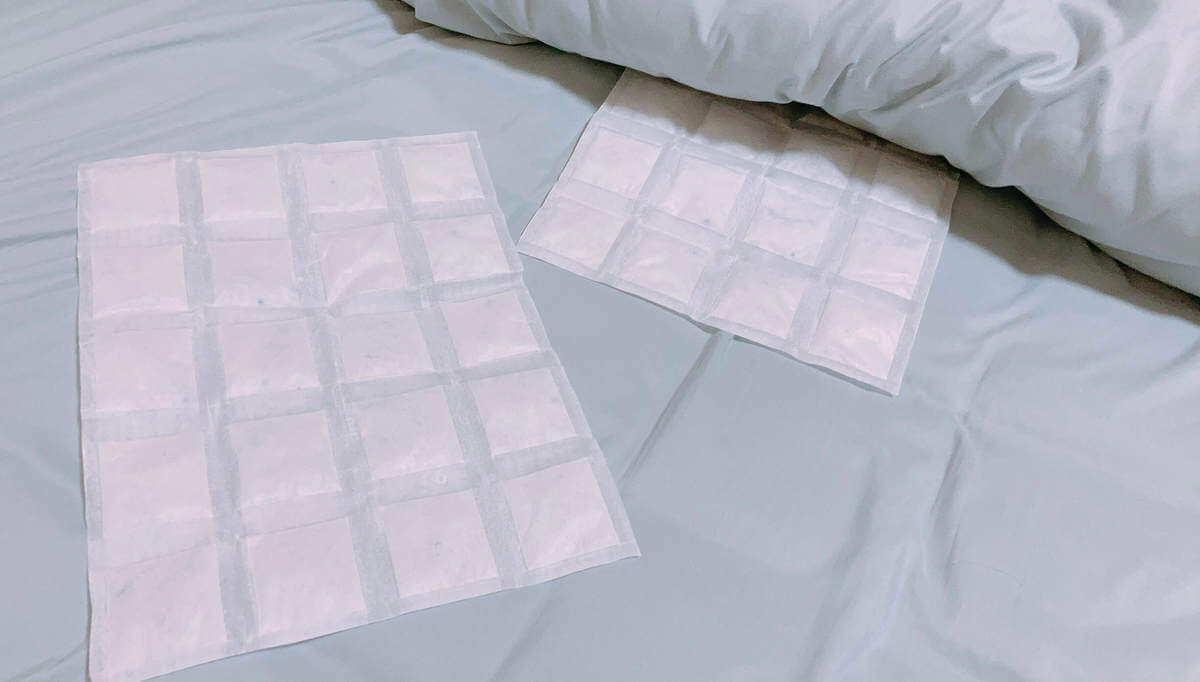 試しにお布団の間に入れて早速実験してみました。2枚入りなので朝2枚布団に挟み押し入れへ。夜ねるときにジメっと感にいつもと違いがあるかを検証。結果、肌で感じるほどいつもと違うサラッと感、効果ありです!