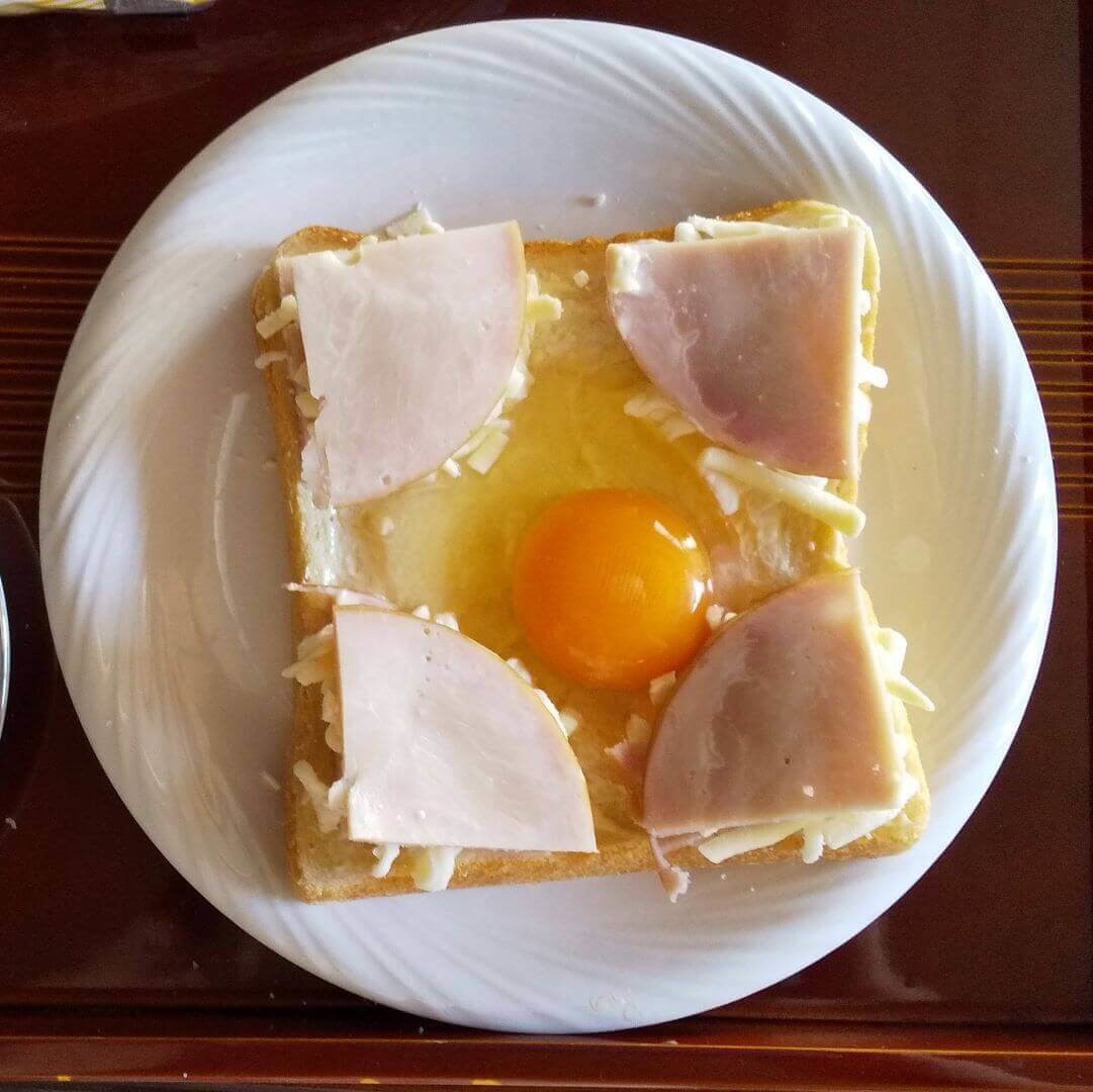 ②食パンの中心を凹ませ卵1個を入れる