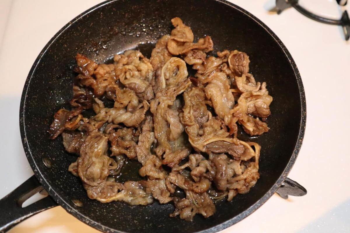 (1)熱したフライパンに牛こま肉を炒めて、すき焼きのタレで味付けします。