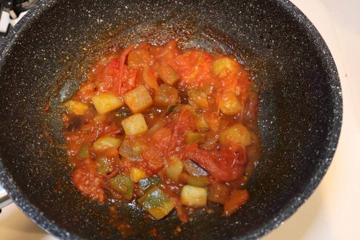 (3)蓋をあけてトマトを潰しながら2分煮たら完成です。