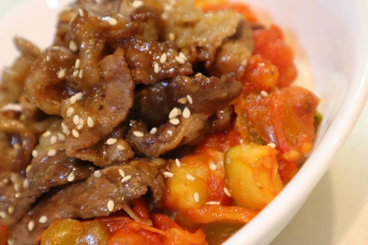 どんぶり物って食べている途中で飽きてしまう事がありますが、ラタトゥイユと焼き肉の2種類のっているので、どちらの味も楽しめるのが嬉しいですね。