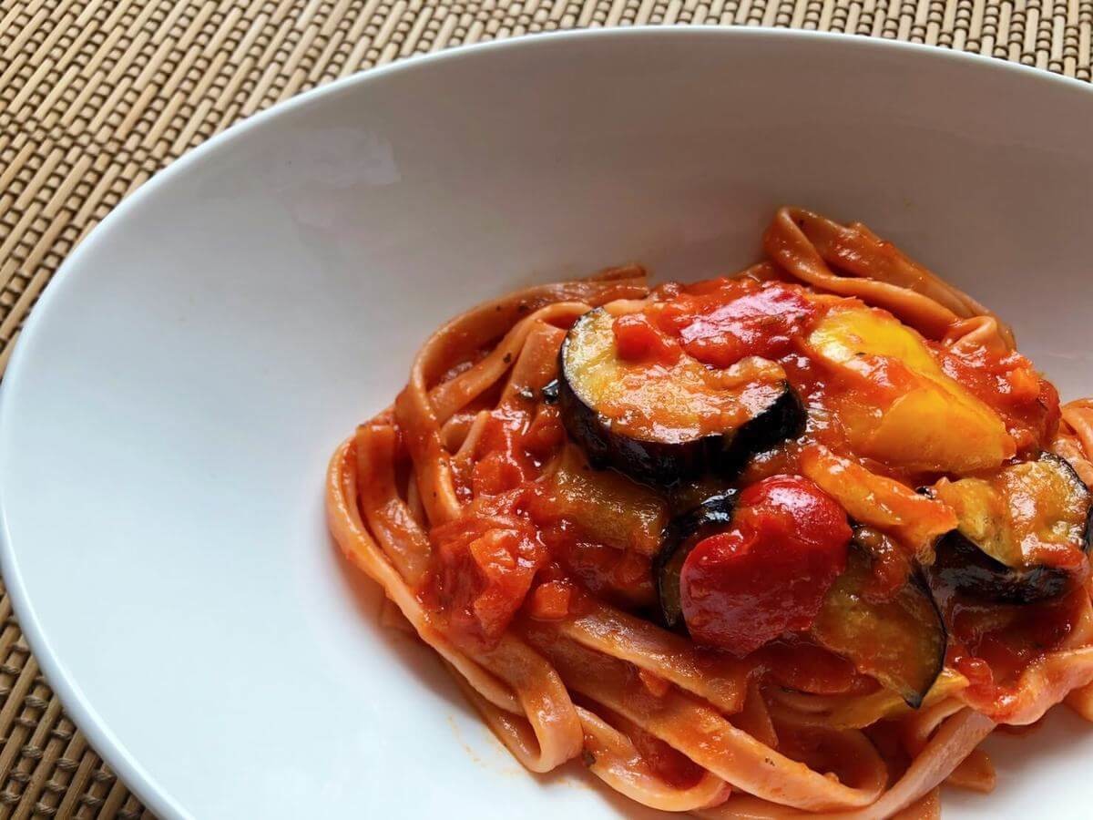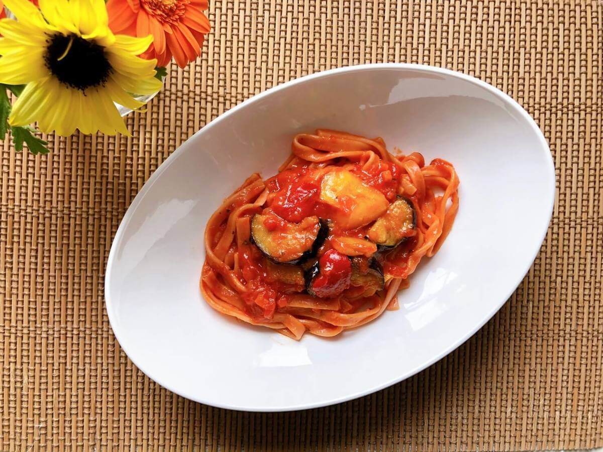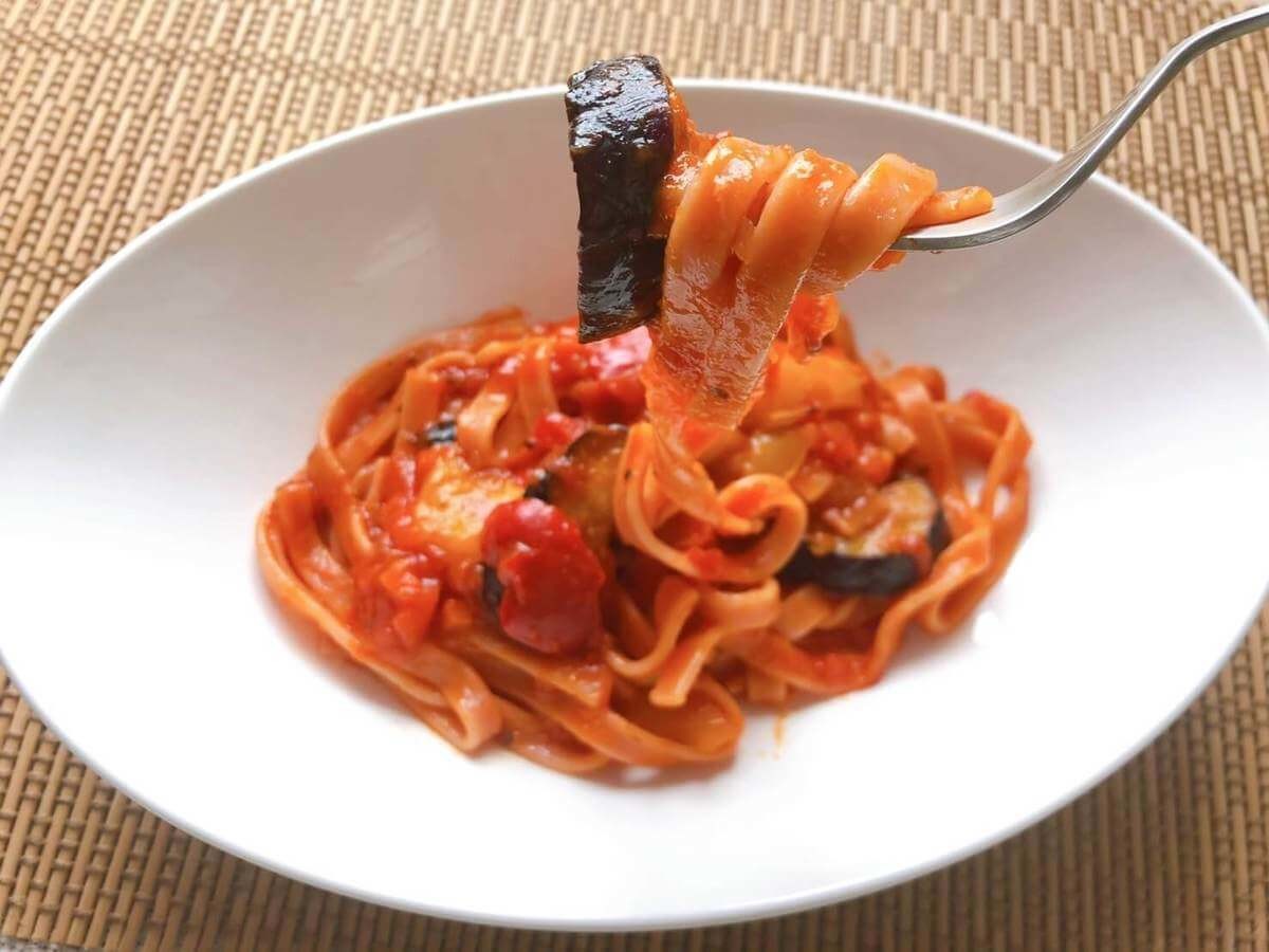 平打ち麺もモッチモチ。コシがあって美味しい!トマトソースとの相性もバッチリです。