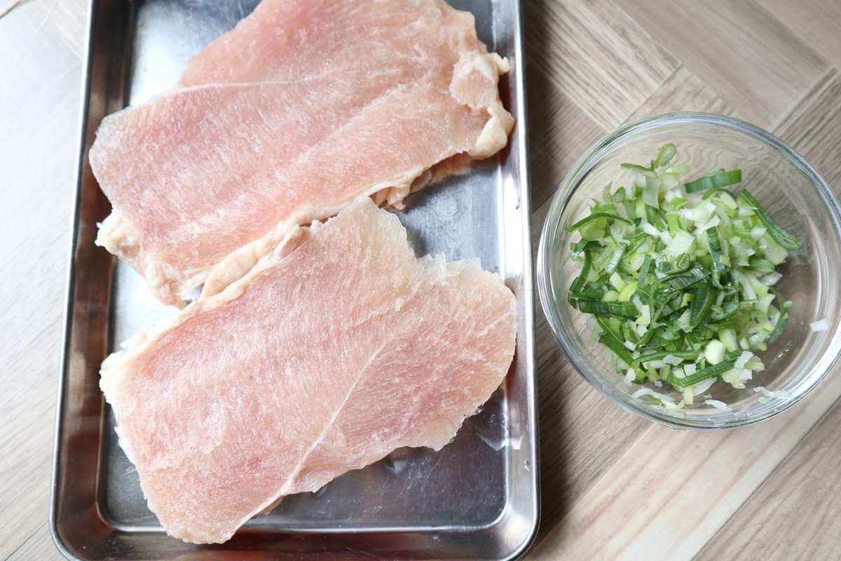 鶏むね肉1枚を厚さを半分に切る。 長ネギ1/2本はみじん切りにする。