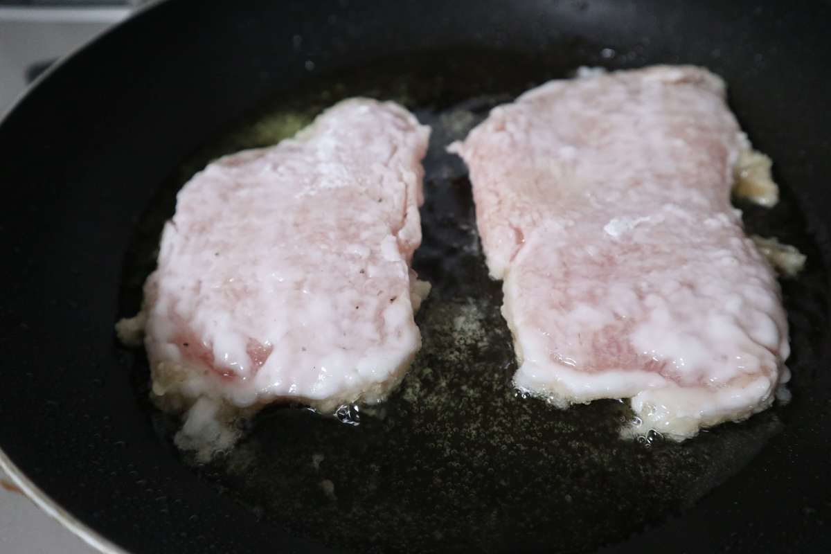 鶏むね肉に片栗粉をまぶす。 フライパンを中火にかけて、1㎝ほど油を注いで鶏肉を両面こんがり揚げ焼きにする。