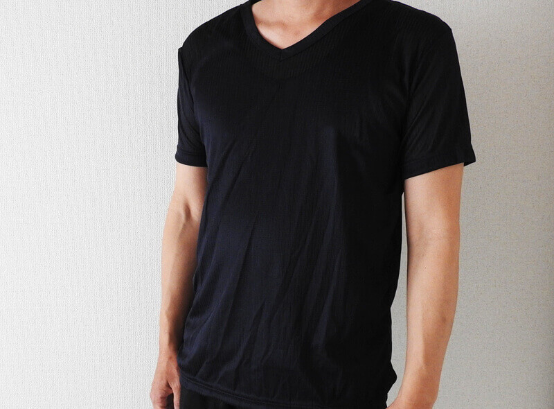 「涼し柔らかい」と書かれたVネック半袖です。着用してみると、風通しが良いようで、暑い季節には大活躍しそうな予感。