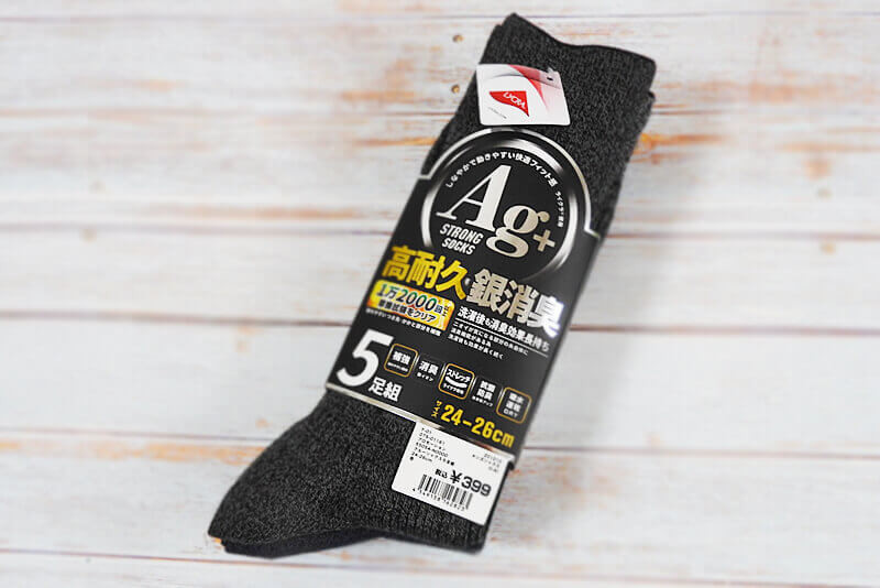 高耐久・銀消臭となんだか凄そうなキャッチコピーがかかれている紳士用クルーソックス。5足組で399円(税込)ですので、1足あたり約80円。