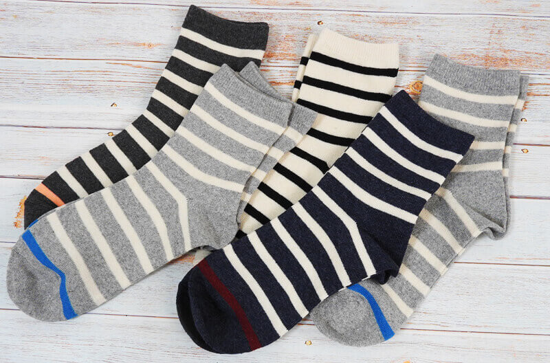 おとなしめな色合いのボーダーソックス。1足あたり約60円という金額は激安!と感じます。上で紹介した、紳士用クルーソックスのようにすごいキャッチコピーはないものの、靴下としては申し分なさそう。