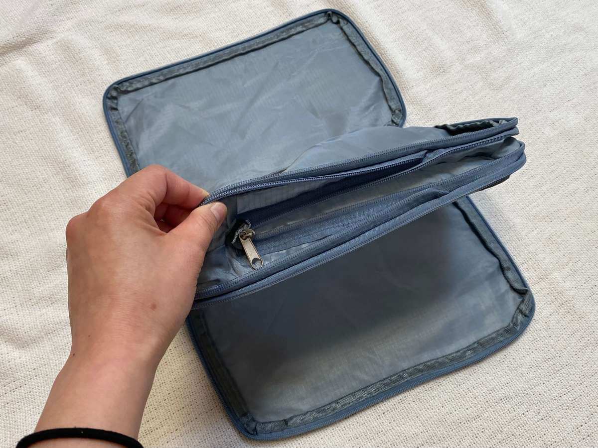衣類をしまったら、真ん中のチャックを閉めます。こうすることで、マチがギュッと収納されて、薄くコンパクトになるんです!