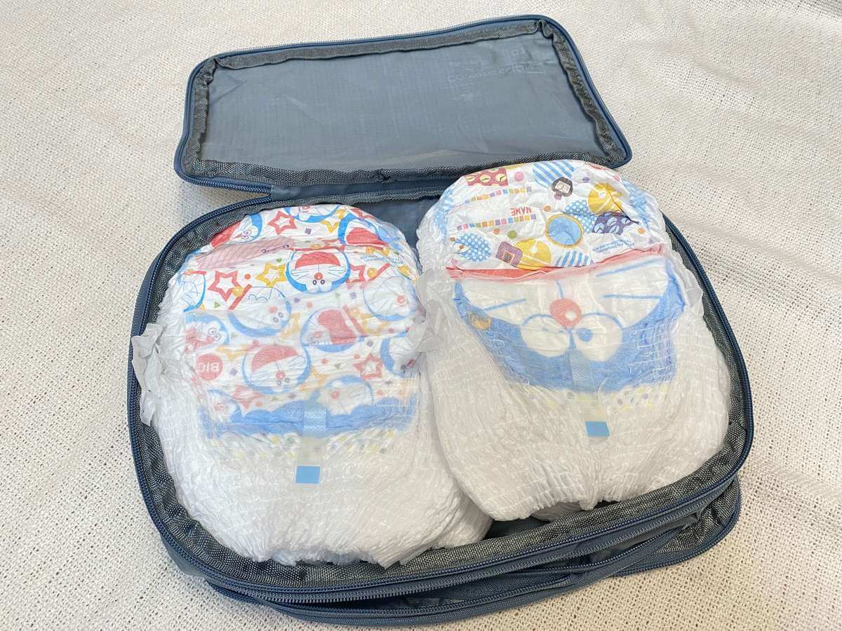 お着替えを上下2セット、ビッグサイズのオムツを10枚入れてみました。