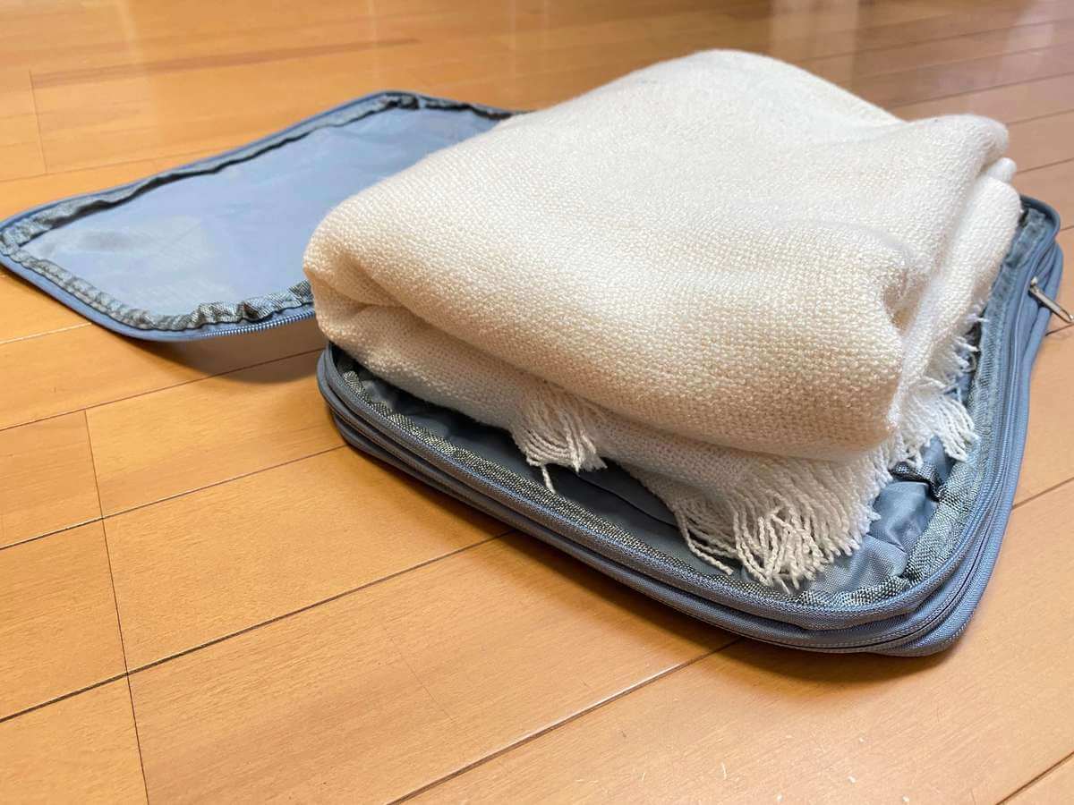 B4サイズほどの大きさのMサイズには、ひざ掛けや冬用のクッションカバーの収納にぴったりでした。