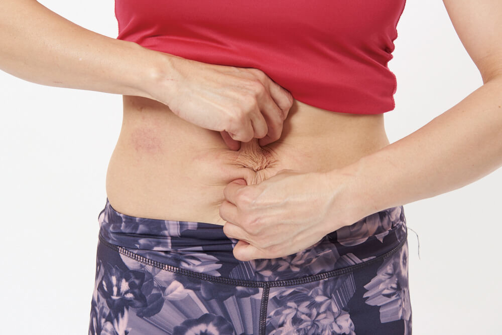 次はおへその斜め上と斜め下をつかみ、フーッとゆっくり息を吐きながら1と同じ要領でしぼります。
