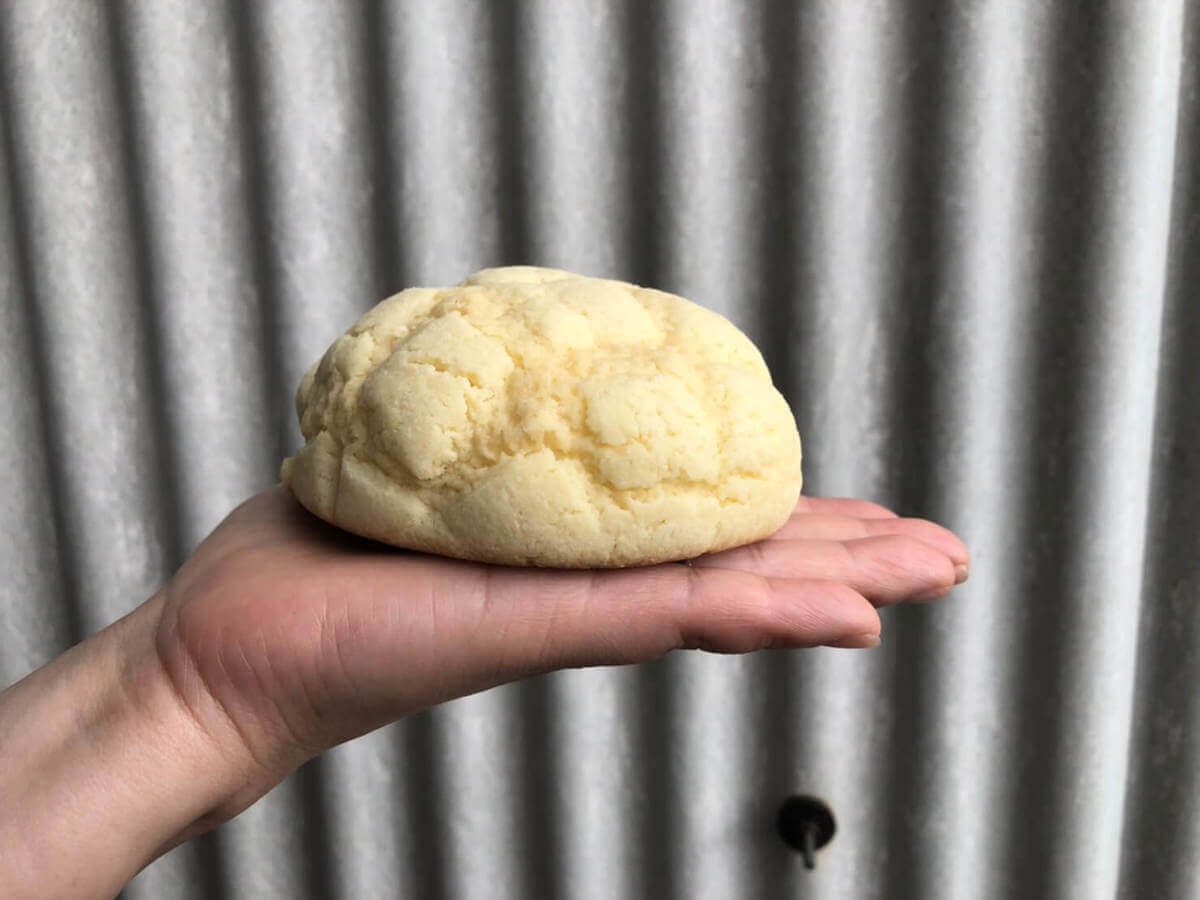 手の平にちょうどおさまるサイズ感で、通常のメロンパンと比べると一回り小さいです。