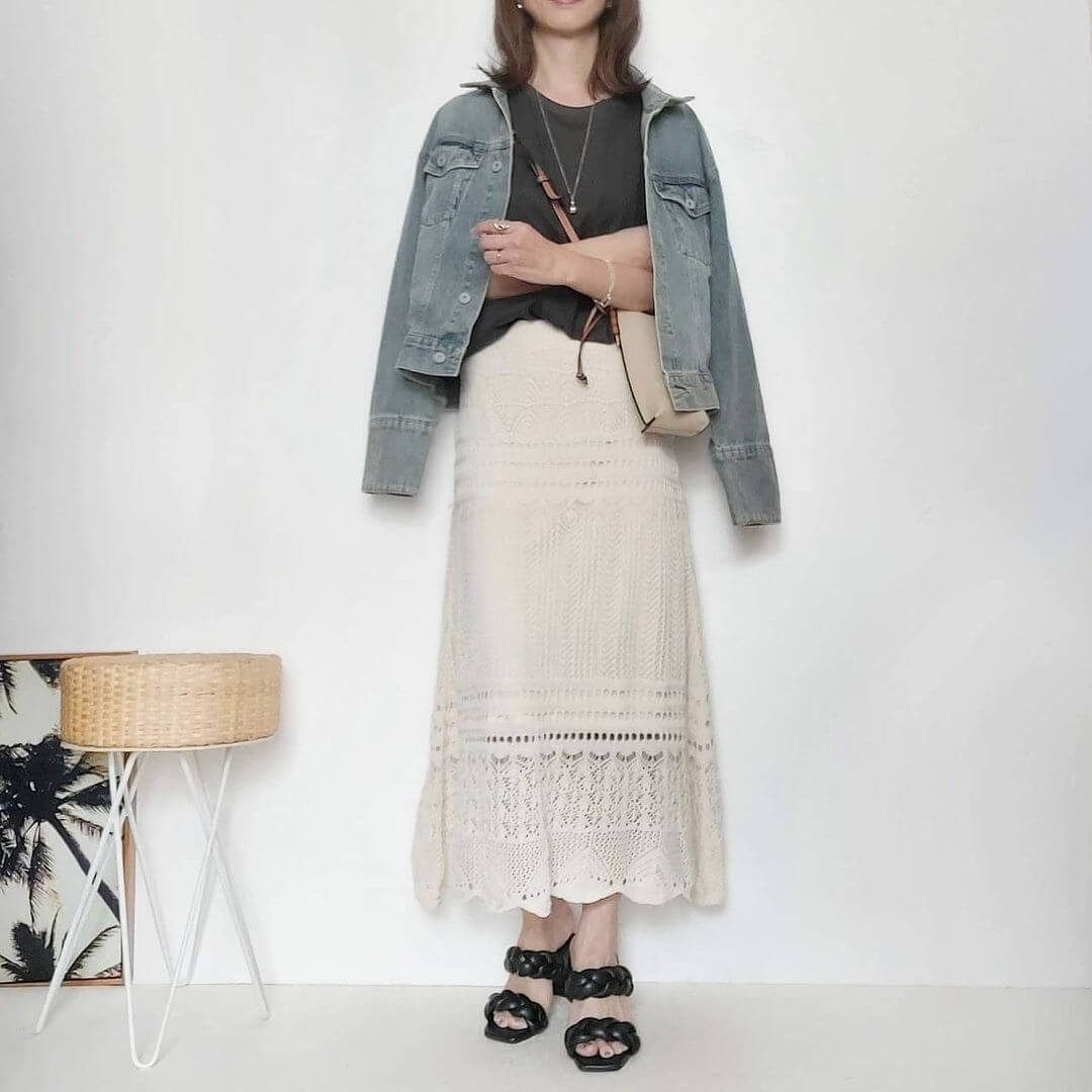 フェミニンな透かし編みニットスカート×グレーTで甘辛ミックスに。