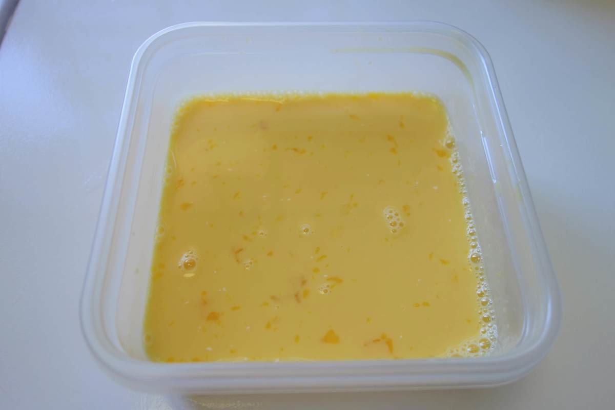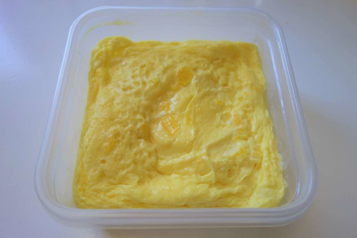 耐熱の保存容器に卵液を移し、ラップをせずにレンジで600Wなら2分、500Wなら2分20秒前後加熱します。
