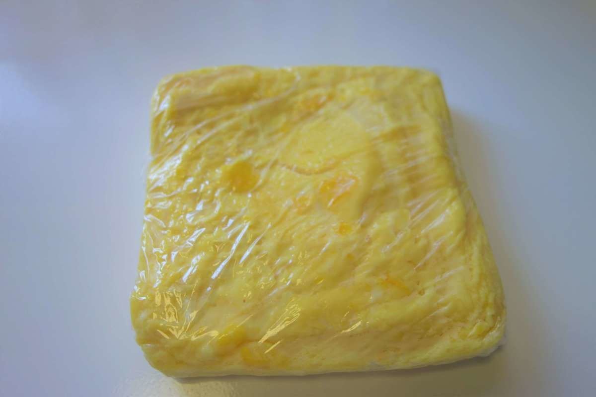 玉子焼きをレンジから取り出し、ラップで包んだら、軽く形を整えて3分程度放置します。
