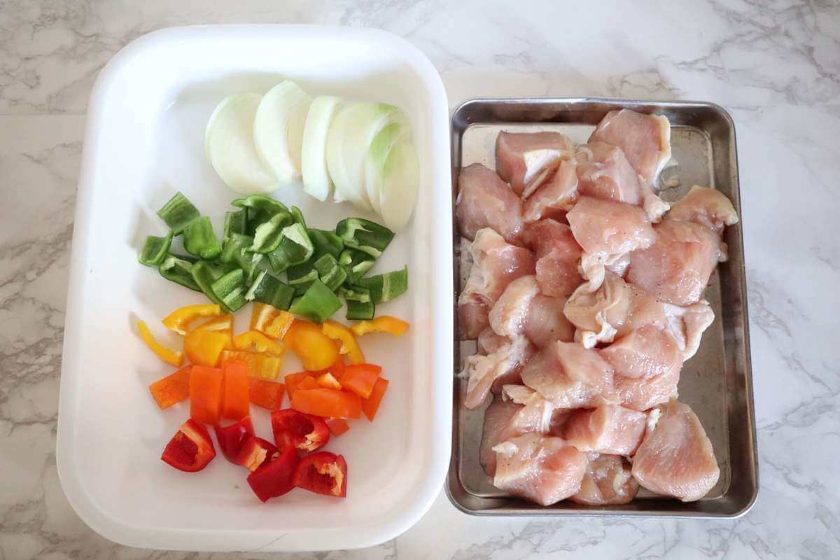 鶏むね肉 2枚 玉ねぎ 1/2個(厚さ1㎝ほどに切る) パプリカ、ピーマン 計120g(角切り) 揚げ油 適量 片栗粉 適量